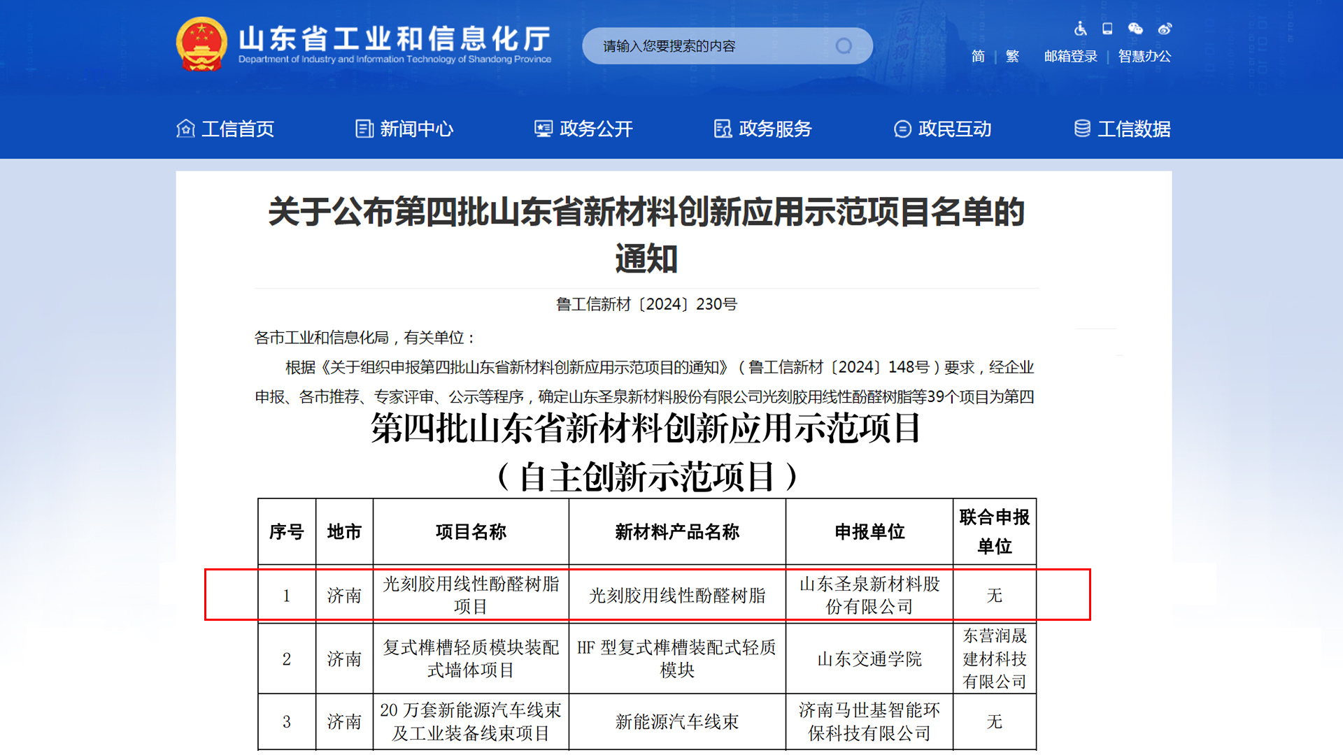 圣泉新材料公司——光刻胶用线性酚醛树脂 成功入选第四批山东省新材料创新应用示范项目