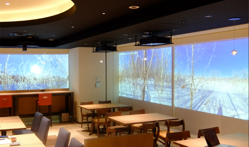 Two wide 2.3-meter (100 inches) large screens were installed in two spots. The 5.1ch surround system allows you to enjoy Hokkaido’s nature while relaxing and enjoying meals without requiring the wearing of special devices such as HMD.