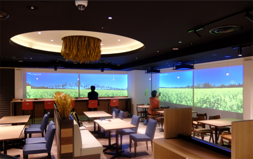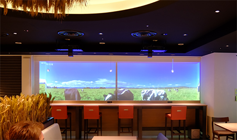In the light-meal eating space installed for the first time in Dosanko Plaza, landscapes of Hokkaido’s four seasons are projected with a projector onto a large screen, and people can have an unparalleled experience and enjoy digital forest bathing. It carries Dosanko Plaza’s wish that the experience here will attract more people to visit Hokkaido.