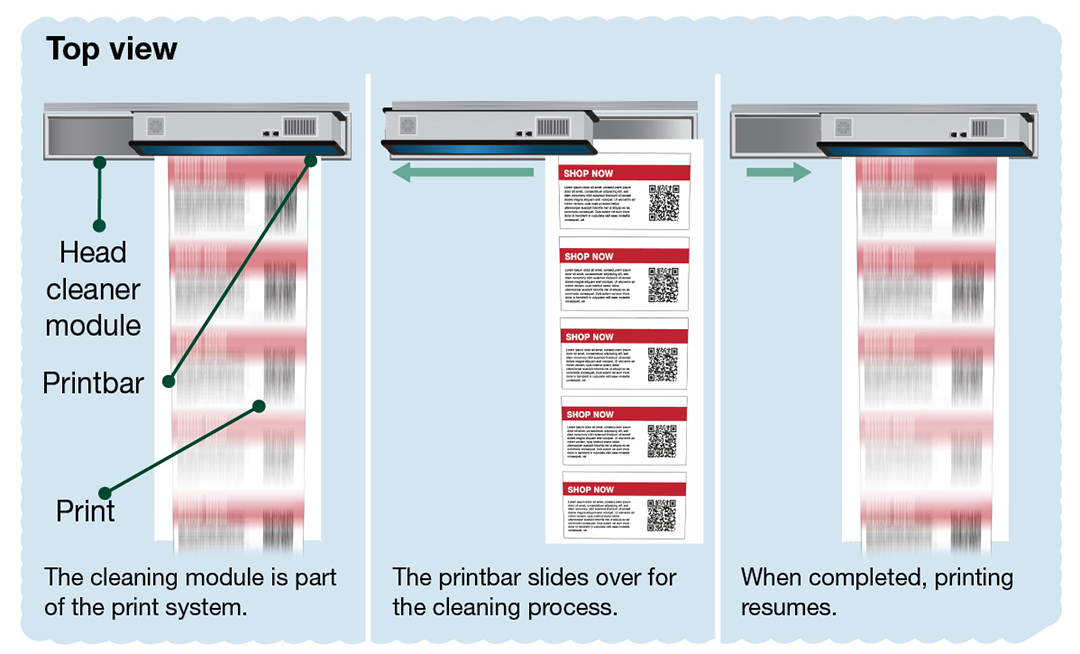 At the touch of a button only once per shift, the cleaning/ capping module cleans the printhead nozzle plate to address misdirected or lost nozzles.